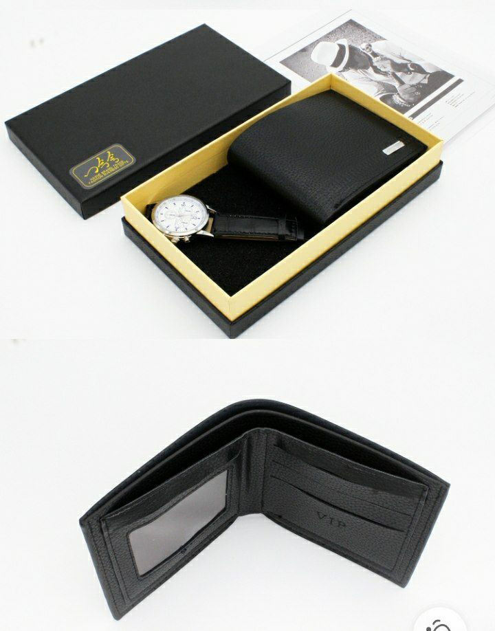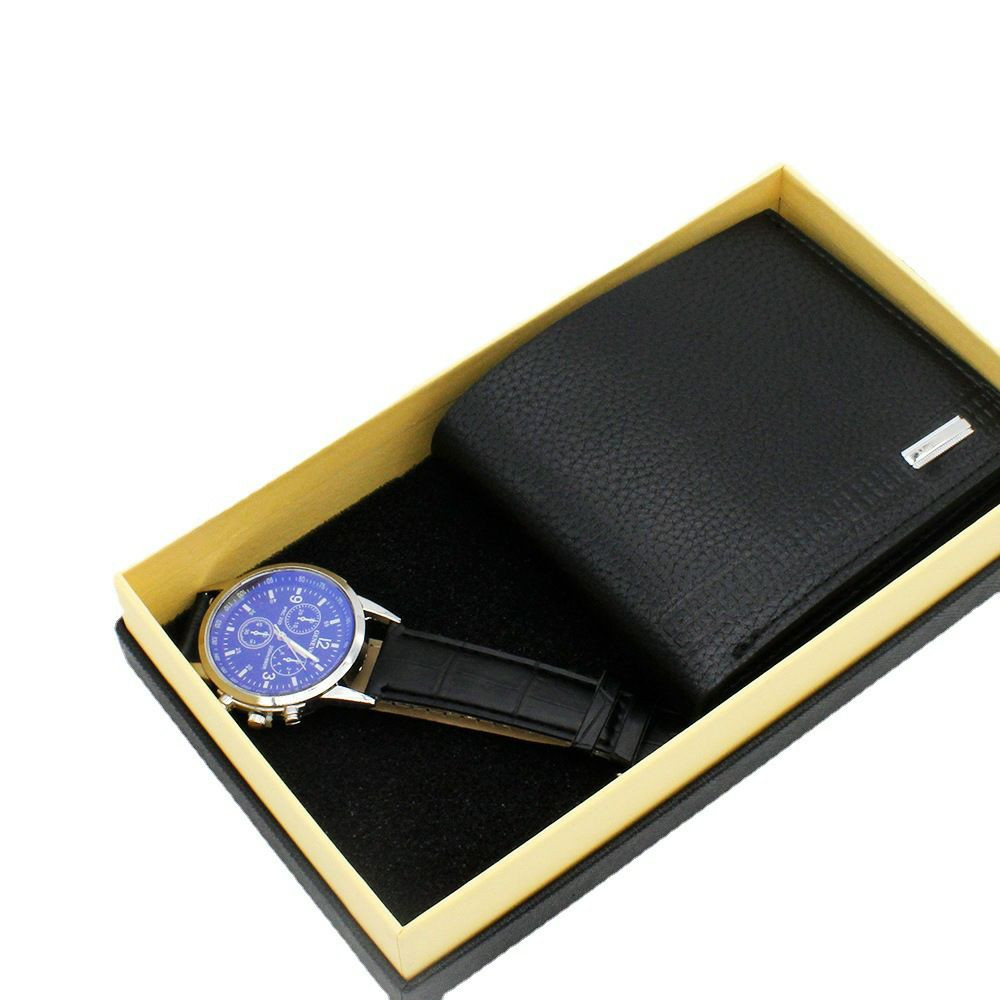 Ensemble cadeau comprenant une montre-bracelet et un portefeuille marron en cuir texturé, présentés dans un coffret noir.