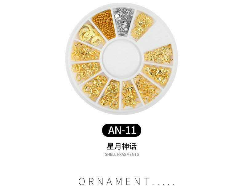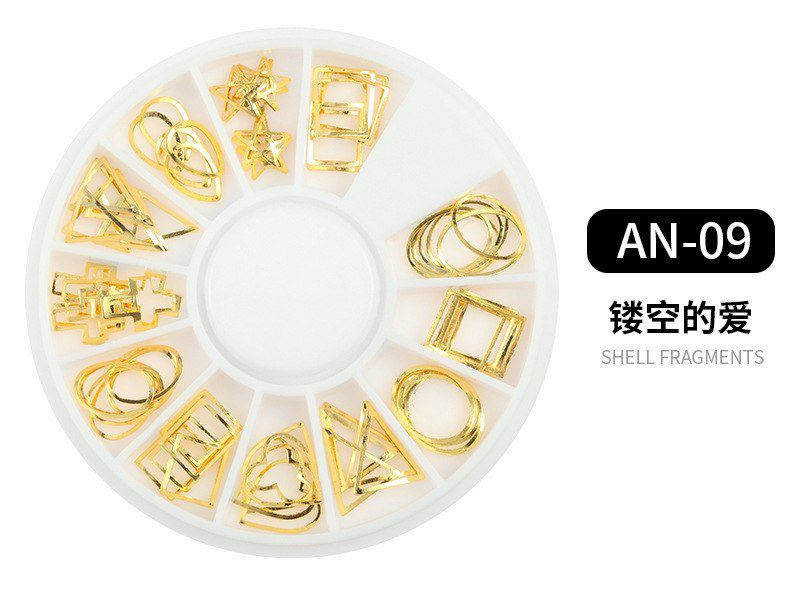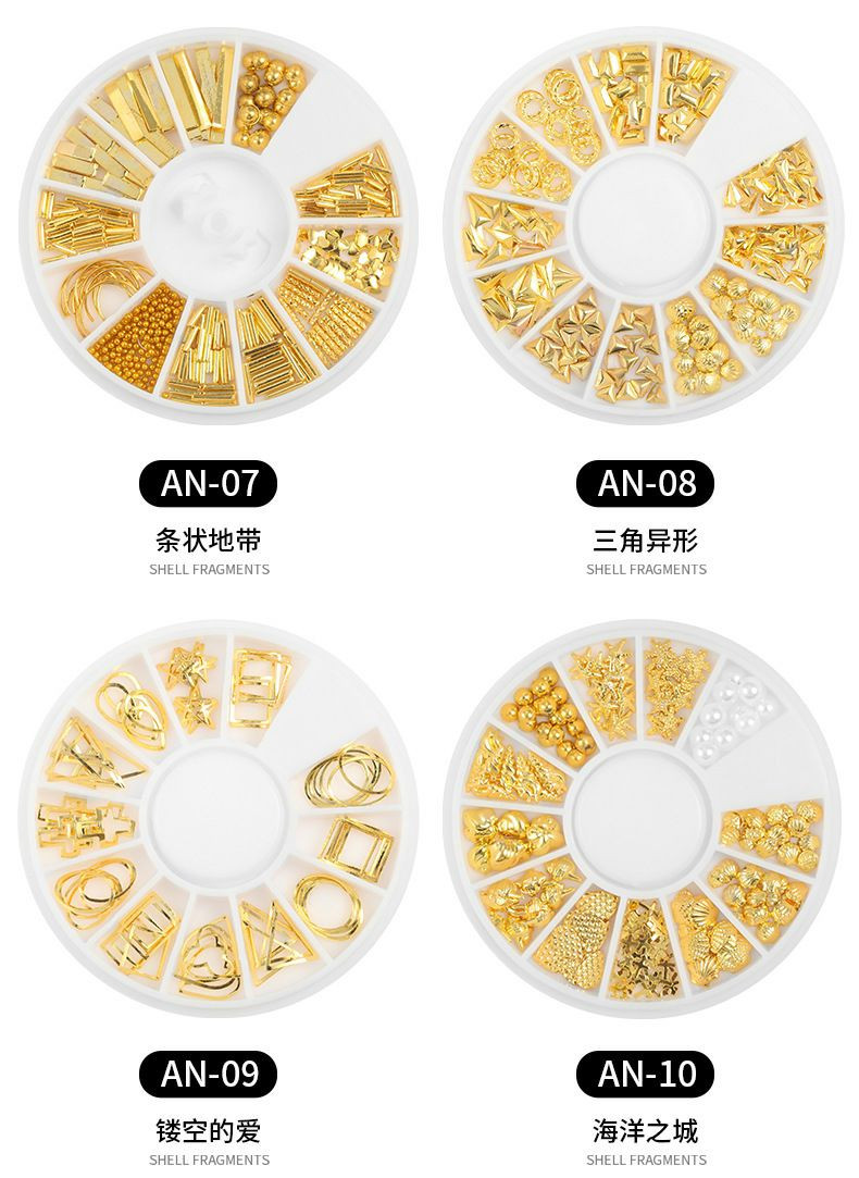 Ensemble de décoration pour ongles Wokoto comprenant des clous métalliques dorés et des charmes.