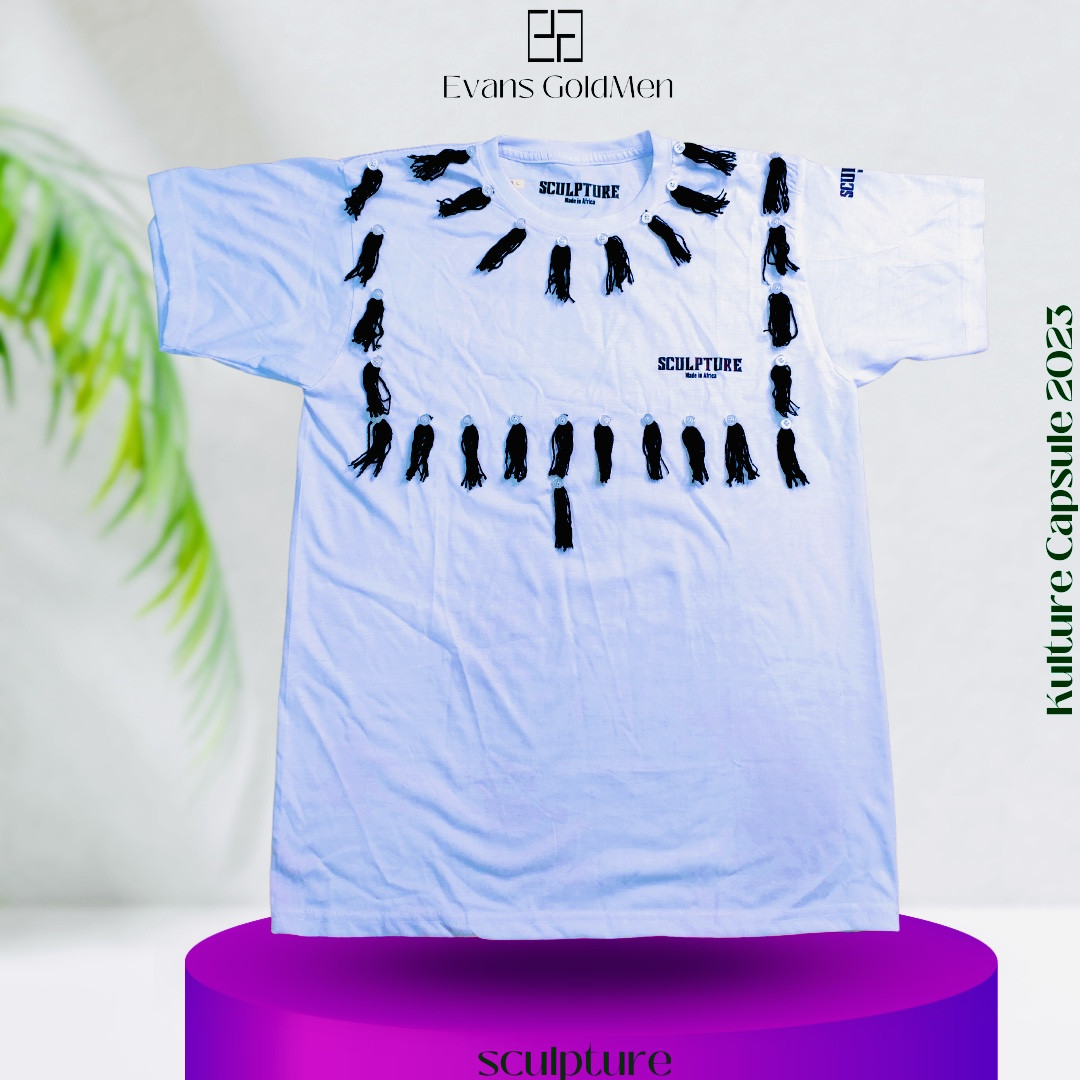 SCULPTURE est un imprimer de t-shirt issue de la collection «Kulture 2023 » de la marque Evans GoldMen. Fabriqué avec du cotton peigné du Bénin et embellit avec des fibres de laine donnant ainsi un côté artistique de ce dernier. Existant en deux coloris (noir et blanc)